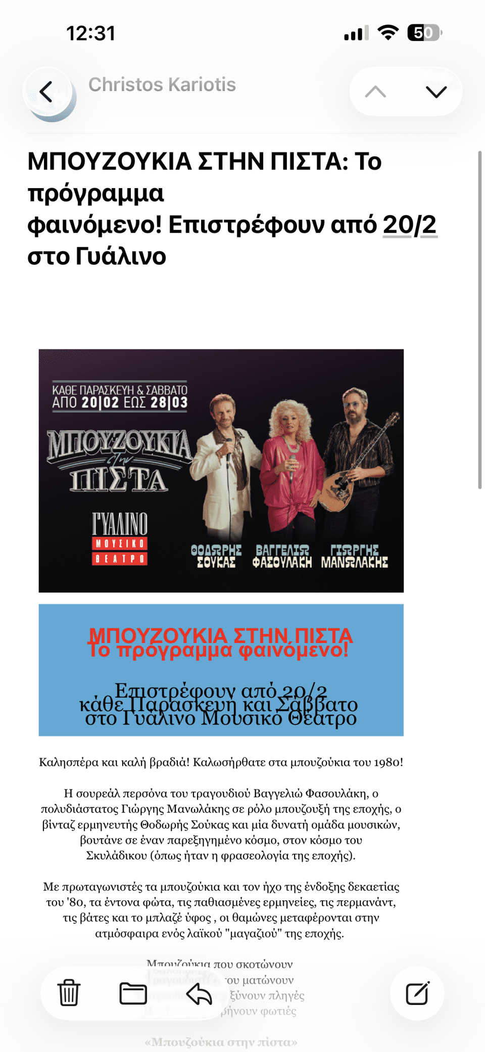 Καλησπέρα και καλή βραδιά! Καλωσήρθατε στα μπουζούκια του 1980! Η σουρεάλ περσόνα του τραγουδιού Βαγγελιώ Φασουλάκη, ο πολυδιάστατος Γιώργης Μανωλάκης σε ρόλο μπουζουξή της εποχής, ο βίνταζ ερμηνευτής Θοδωρής Σούκας και μία δυνατή ομάδα μουσικών, βουτάνε σε έναν παρεξηγημένο κόσμο, στον κόσμο του Σκυλάδικου (όπως ήταν η φρασεολογία της εποχής).