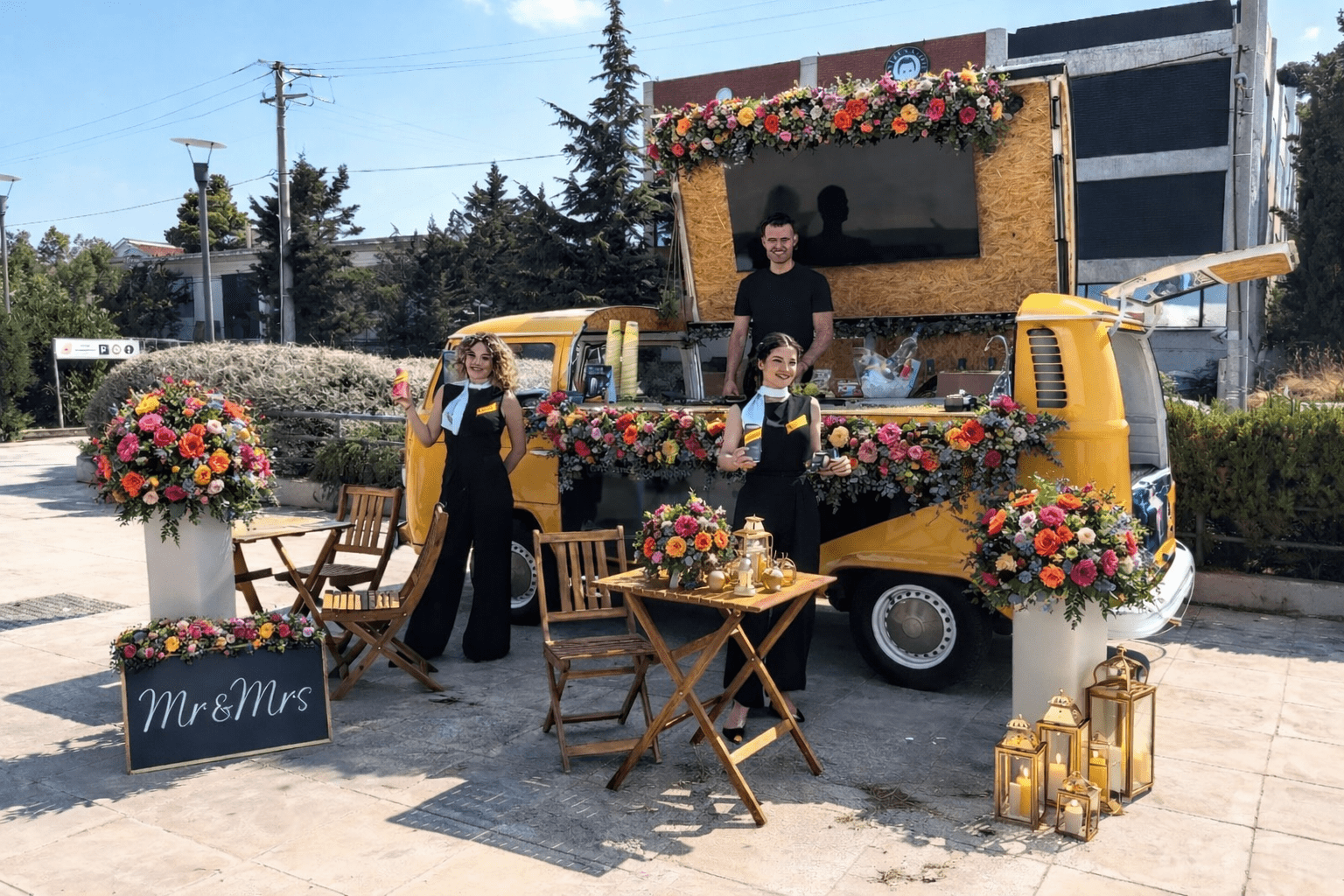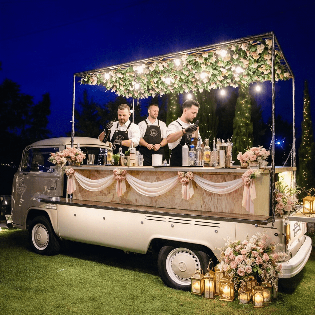 Από το welcome drink στην άφιξη μέχρι το after party, το van προσαρμόζεται απόλυτα στη ροή της εκδήλωσης: σερβίρει δροσιστικά ποτά την ώρα της υποδοχής, premium cocktails και καφέ κατά τη διάρκεια της δεξίωσης και μετατρέπεται σε candy, ice cream ή pizza bar που κρατά το κέφι ψηλά μέχρι αργά.