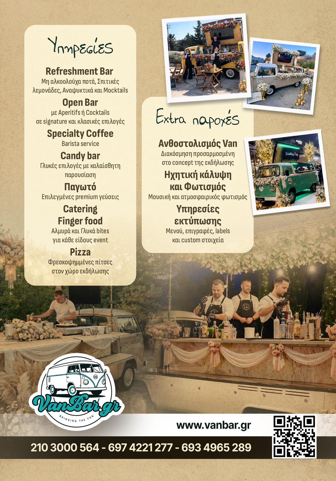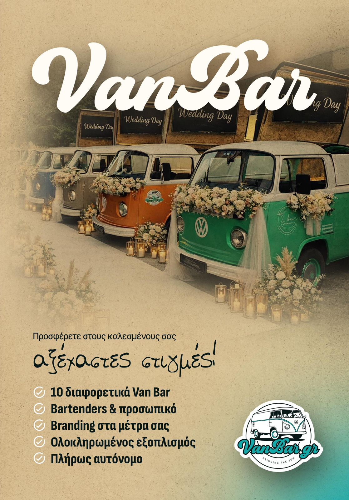 Το Vanbar.gr δεν είναι απλώς ένα bar πάνω σε τροχούς. Είναι μια πλήρης εμπειρία φιλοξενίας, σχεδιασμένη για να μετατρέπει κάθε event σε κάτι πραγματικά αξέχαστο.
